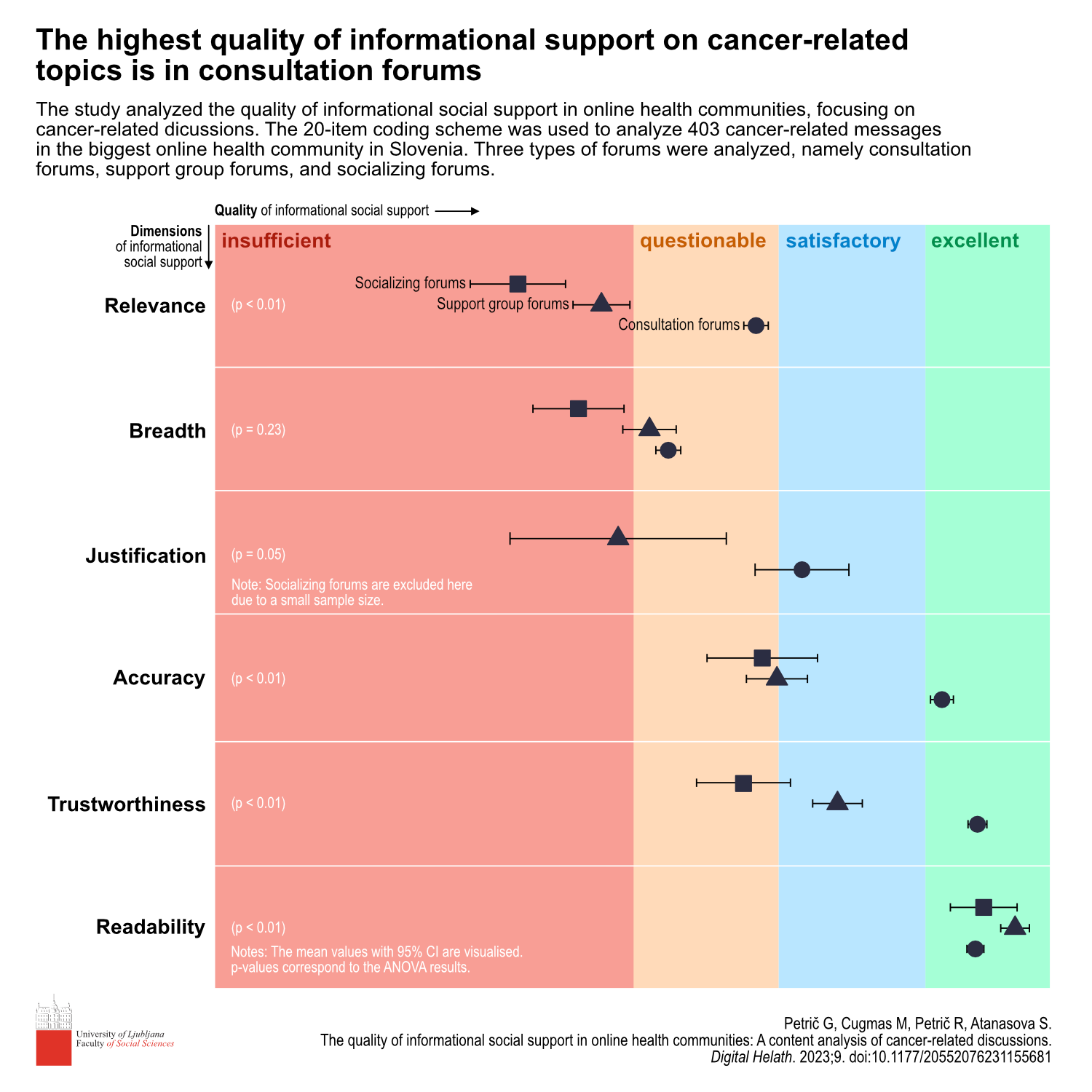 The project aimed to identify cancer-related messages in the online healthcare community MedOverNet among approx. 3 million messages posted between 2015 and 2019. Different machine learning algorithms (naive Bayes classification, support vector machine, decision trees and random forests) were used on lematized text with removed stop-words. The most efficient was the random forest model with 92% sensitivity and 89% specificity. Around 0.6% messages were about cancer – 2.9% within health consulting discussions, 1.9% within social support discussions and 0.5% within socializing discussions. The identified messages were considered in the sampling procedure to analyze the quality of cancer-related information in the online healthcare community MedOverNet.