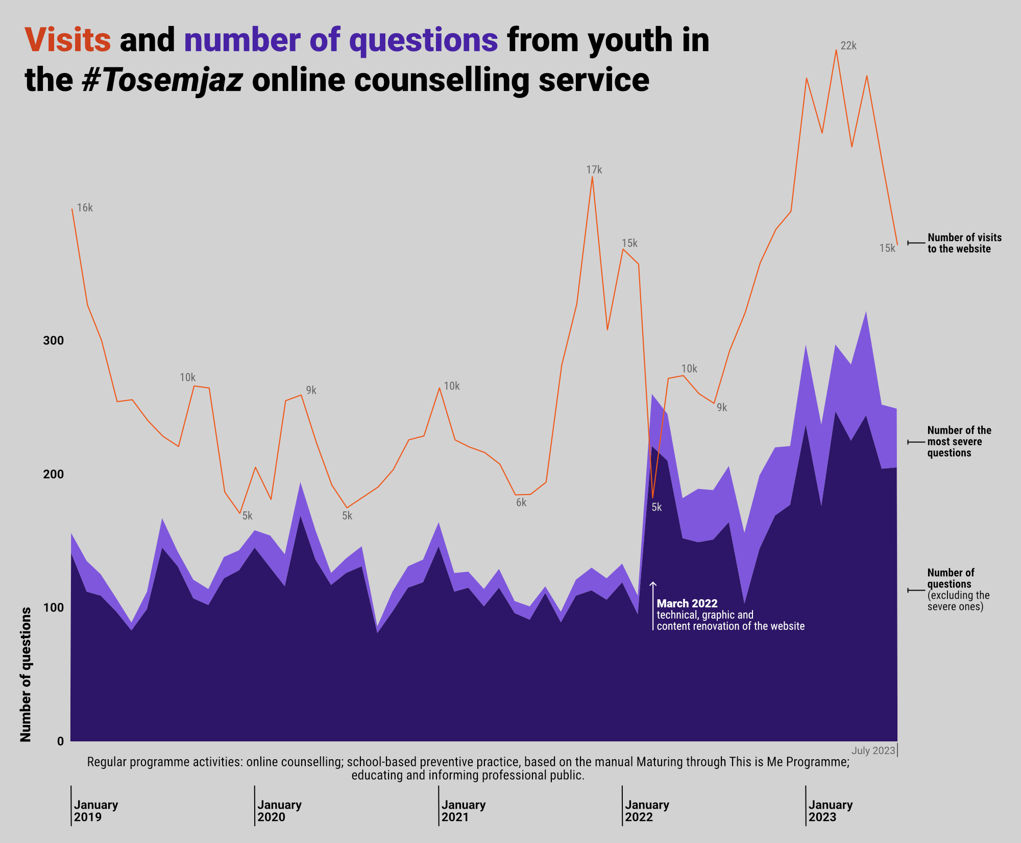 TSJ Dashboard enables interactive and real-time analysis of the users’ questions and counsellors’ answers in the online counselling service This is me, which is maintained by the National Institute of public health RS. Also, the data from Google Analytics can be analyzed in TSJ Dashboard. The tool is designed as a web application. This means that it can be used on any computer with a web browser and internet access. TSJ Dashboard offers different kinds of data analysis and visualizations. Partial analysis (aggregated data, tables) can be exported in .csv format (can be easily opened with MS Excel). Also, all microdata can be exported for further statistical analysis.